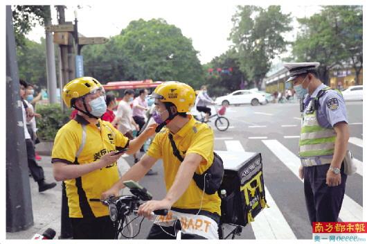 5月14日,广东省公安厅交通管理局开展“一盔一带安全常在”行动,警企联合劝导外卖骑手佩戴安全头盔。南都记者何玉帅摄