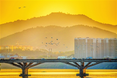 伴着晚霞,成群南迁的鹭鸟飞翔在梅州梅江河上空。何志林摄