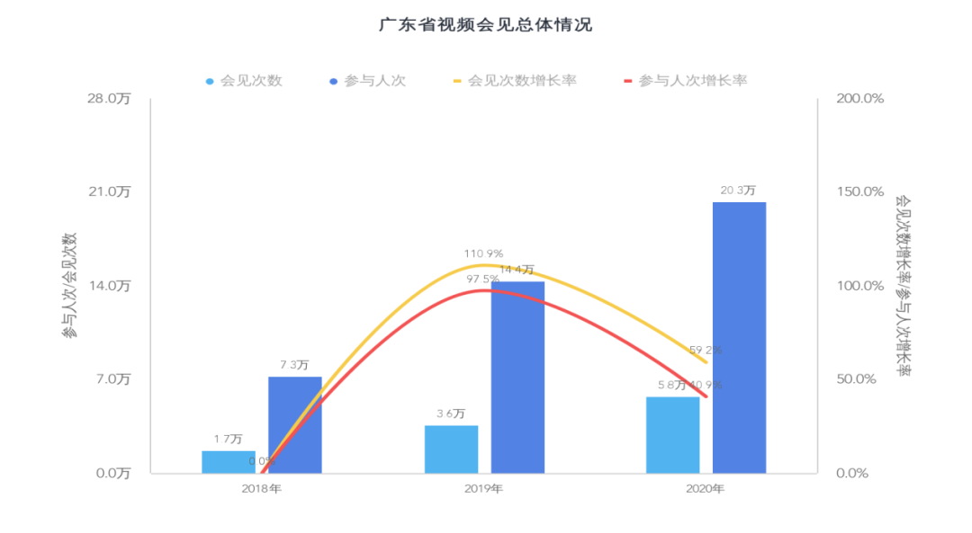 自2018年初全面启动以来,全省累计开展视频会见13万余次,参加会见人员超50万人次(其中家属36万余人次,服刑戒毒人员13万余人次)。三年来,群众对参加视频会见的需求快速增长,视频会见次数、参加人次逐年大幅提升,2020年较2018年分别增长341%、278%.