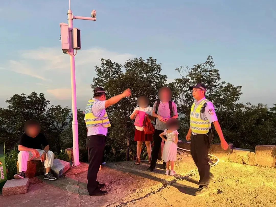 接报后,佛山市公安局高明分局民警赵崇亮和辅警区宇东马上上山援助,最终在晚霞消失前,成功帮助陈先生一家下山。