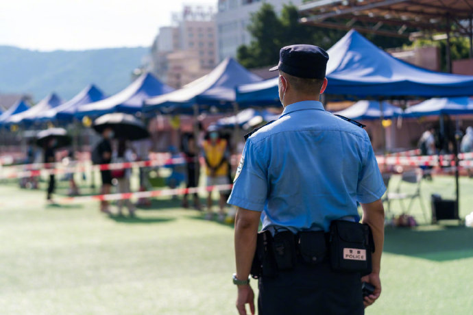 民警在广州市白云区京溪街核酸现场维持秩序。梁杰 摄