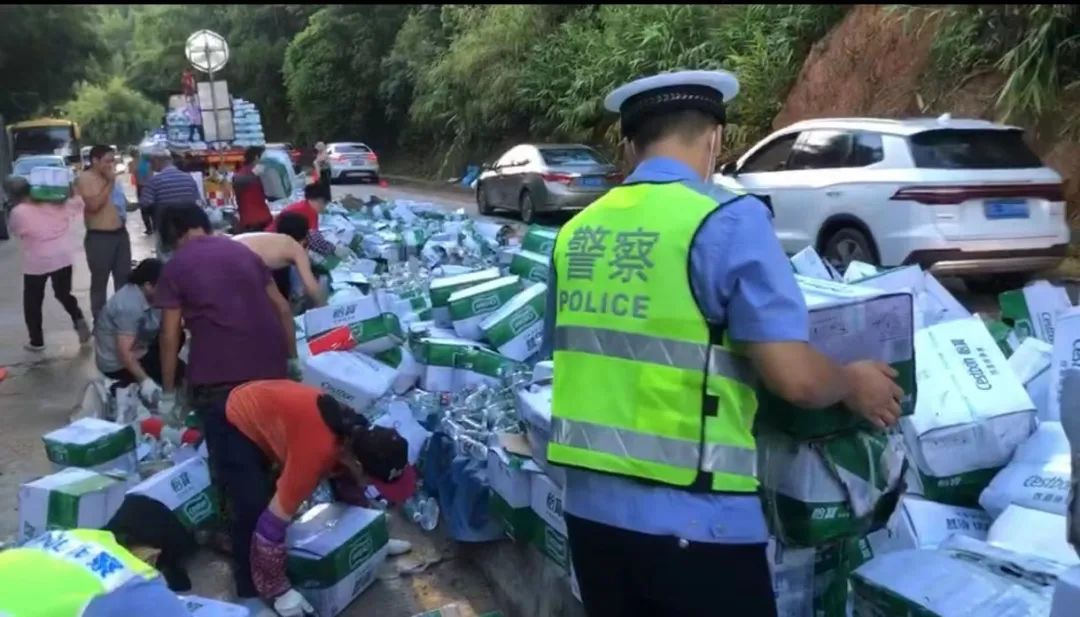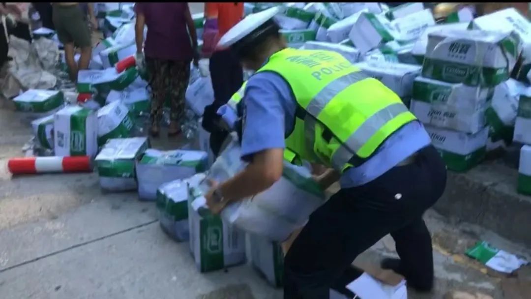 10月1日下午,肇庆广宁公安交警接报称:一辆大货车运载着32吨矿泉水,行驶至S350广宁白石路段急弯处时;由于货物没有固定好而发生倾倒,货物散落一地,占据多条车道,严重影响道路通行。接报后,警员迅速赶往现场处理。