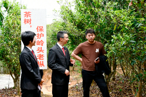 座谈结束后,法官们走进岭头单丛老丛茶园保护区,了解老茶树的生长情况,以及岭头单丛茶农产品国家地理标志的持有和保护情况,并结合司法实践中典型地理标志侵权案件向茶协工作人员普及常见侵权手法和维权的合法途径,并提醒茶叶协会要积极指导地理标志注册人健全完善地理标志的使用管理机制,充分发挥地理标志的影响力,擦亮岭头单丛茶农产品国家地理标志“金名片”。