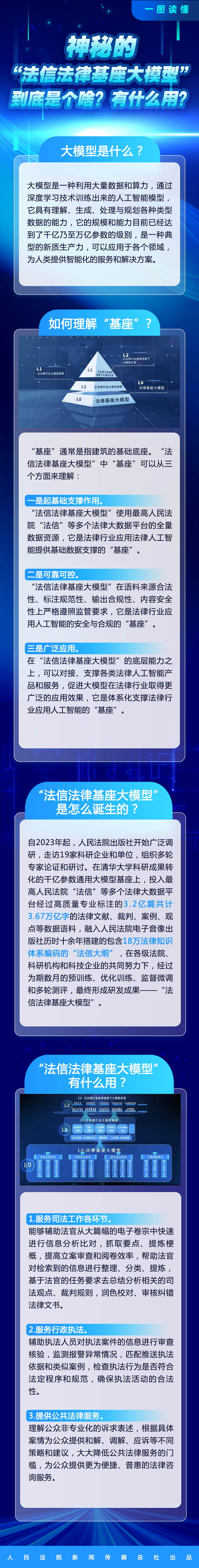 2024年11月15日,最高人民法院举行新闻发布会,发布“法信法律基座大模型”。这一国家级法律AI基础设施一经发布即获得广泛关注,神秘的“法信法律基座大模型”到底是个啥?有什么用?一张图,带您了解。