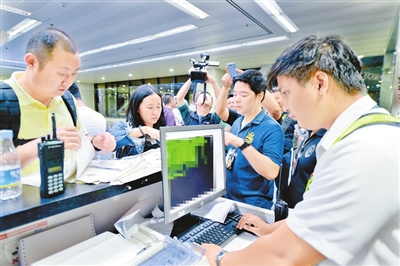 在白云机场候机楼,特警队员按照规范列队、点名、安检、出关,并顺利登机。