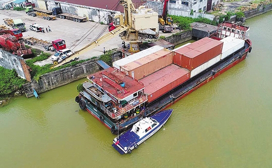 中山警方在东升镇小榄水道东升码头查获装载冻肉的船只