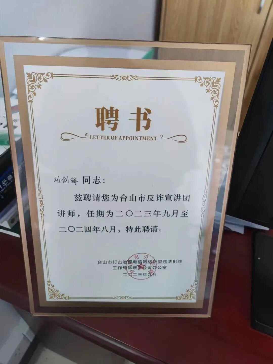 刘剑锋的反诈宣讲团讲师聘书