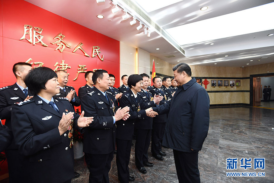上午,习近平首先来到北京市公安局,走进合成作战指挥中心和指挥大厅,通过大屏幕了解勤务指挥调度、巡逻警务、视频警务、区域警务合作和京津冀警务协同发展等工作情况。指挥大厅内,习近平通过视频连线一线执勤民警,向他们表示诚挚慰问,叮嘱他们注意安全、保重身体,并向全国广大公安干警拜年。在北京市公安局一层大厅,习近平同公安英模和干警代表一一握手。习近平强调,党中央十分关心过节期间全国特别是首都地区的社会稳定,为的是确保人民群众平平安安过好年。今年是新中国成立70周年,确保首都社会稳定,北京市使命光荣、责任重大、任务艰巨。要统筹推进各方面工作,坚决完成好任务,让党中央放心、让全国人民放心。