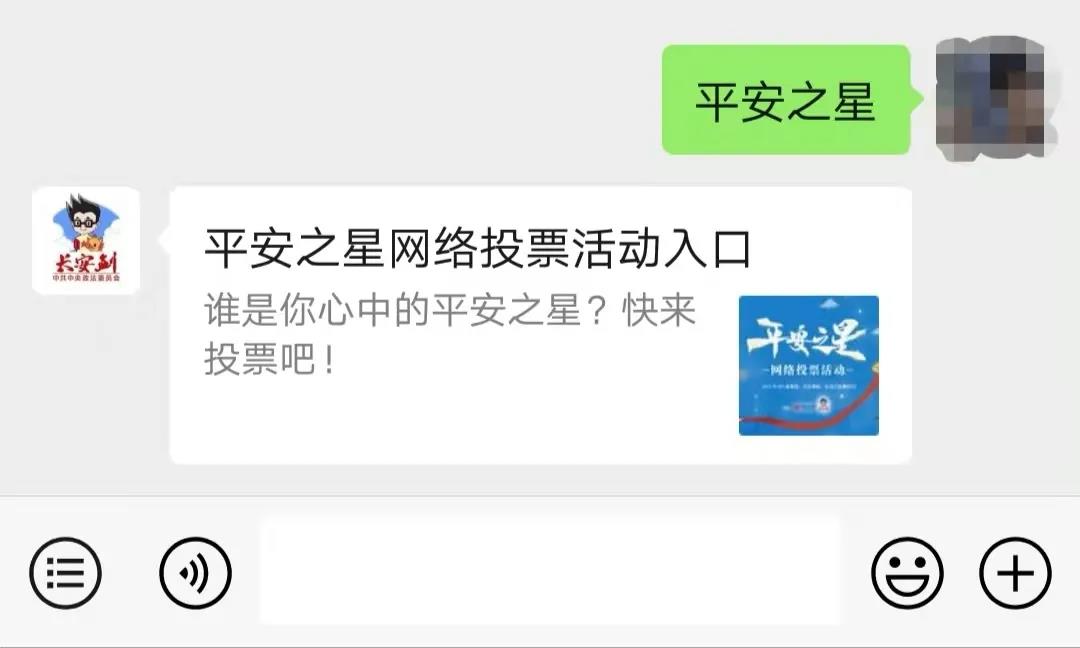 进入会话框,输入:平安之星,即可得到投票链接图文,点击图文进入投票页面。