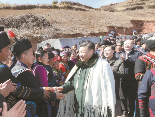 中华民族传统节日农历春节来临之际,中共中央总书记、国家主席、中央军委主席习近平来到四川考察调研,看望慰问各族干部群众,向全国各族人民致以美好的新春祝福。这是2月11日上午,习近平在凉山彝族自治州昭觉县解放乡易地扶贫搬迁新村火普村同乡亲们亲切握手。新华社记者鞠鹏摄